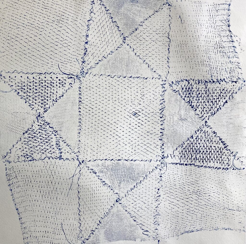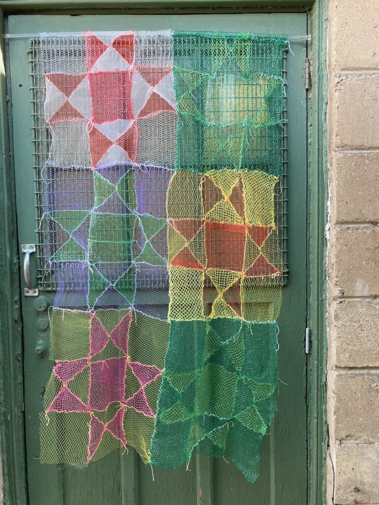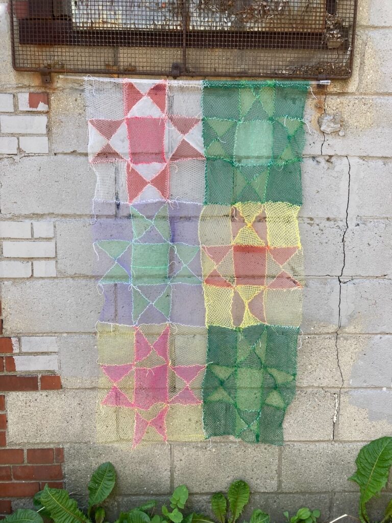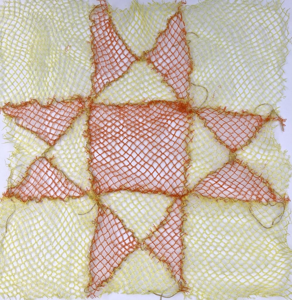 In my caregiving roles I am shopping, washing, peeling, cutting, juicing, making meals for my family. Plastic mesh produce mesh bags represent both care and waste. I collected my own bags for about one year and then asked my family, friends and neighbours to collect these bags for me. Exploring my grandma’s quilting books I found the 8-point star an appealing shape and started making square quilt blocks out of the produce mesh.